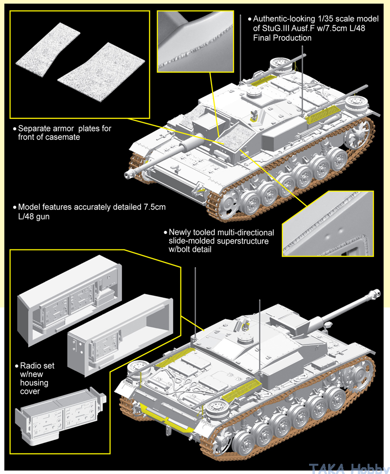 StuG III Ausf. F: (Sd.Kfz 142/1; March–September 1942, 366 produced) long 7.5 cm StuK 40 L/43 gun, allowing the Ausf. F to engage most Soviet armoured vehicles at normal combat ranges. An exhaust fan was added to the rooftop to evacuate fumes from spent shells, to enable the firing of continuous shots. From June 1942, Ausf. F were mounted with longer 7.5 cm StuK 40 L/48 gun.