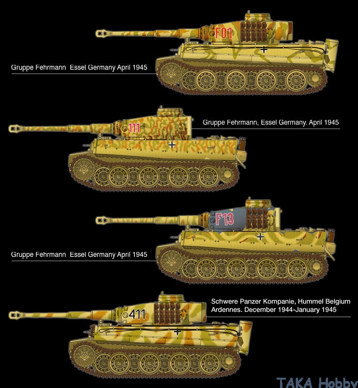 In the beginning of 1945, Kampfgruppe Schulze and Oberleutnant Fehrmann formed a division of six Tiger I and five Panther tanks with the intention of going into the Ruhr area. The Tiger tanks were commanded by Oberleutnant Ferhmann and were designated with 'F' to denote their 'Gruppe' commander hence F01, F02, F05... F13.