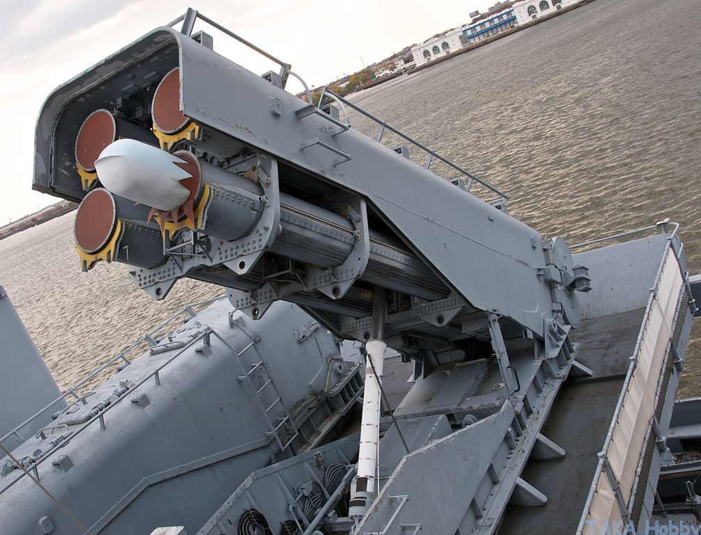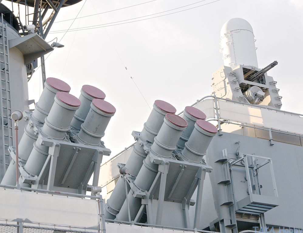 RGM-84 Harpoon Anti-Ship Missile & Phalanx Close-In Weapons Systems (upper-right). [1983] (photo credit: Steven Fine)